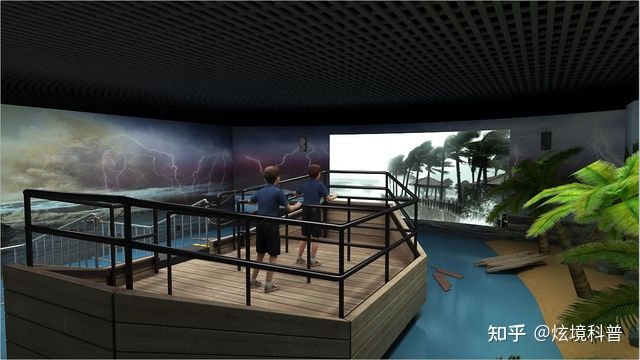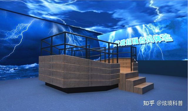 臺風體驗館現場模擬效果逼真,音效一流,立體感強。運用影音、風效和電子噴霧技術,通過噴霧、燈光、出風、音響、影像多媒體等系統,為體驗者模擬出一個臺風來臨時的真實場景。
